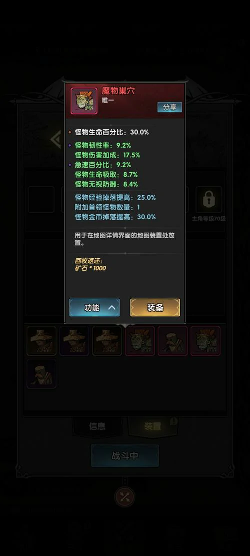 - 地图装置搭配:参考帖子封面地图2-1区域,角色80级前装备绿色集群装置,80级后更换为紫色异界装置。异界装置可升级,背包界面点击升级选项,升级后提供100%额外经验获取加成。普通玩家80至100级建议携带一个+10异界装置,100级后考虑携带两到三个。