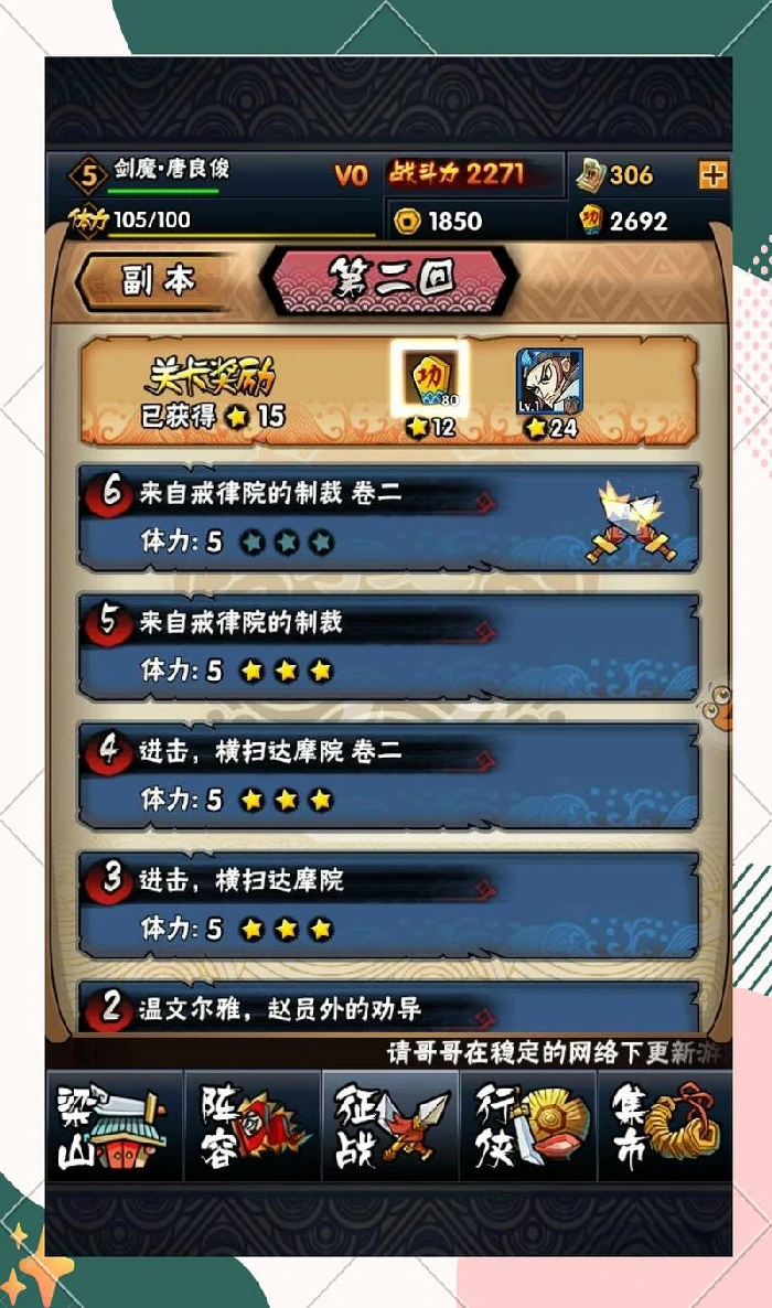技能搭配为游戏精髓:不同武将技能联动,产生“一加一大于二”的效果。例如武松与鲁智深组合,武松生命较低触发“醉打蒋门神”重创单一敌人后,鲁智深接续施展“倒拔垂杨柳”,对全体敌人造成伤害并削弱攻击。此配合能在战场发挥强大效果,助力玩家顺利取胜。