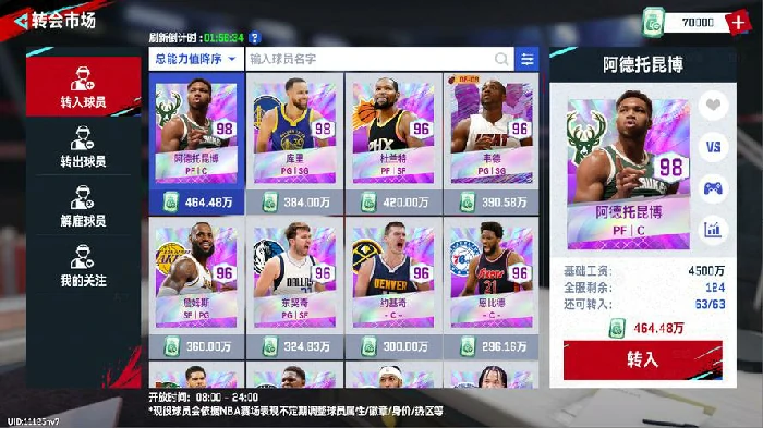 最强NBA霍福德:A级球员,能力全面。进攻端中距离投射稳定,基础能力值近500分,可当可靠得分点。中锋身高体重支撑篮板盖帽,防守移动速度和技巧一般。