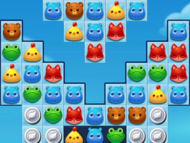 开局先观察地图构造:冰块覆盖大部分区域,第一排左三有魔法石,中间第五、六行是银币。银币阻碍消除,首要目标是打开更多区域,让更多小动物掉落参与消除。