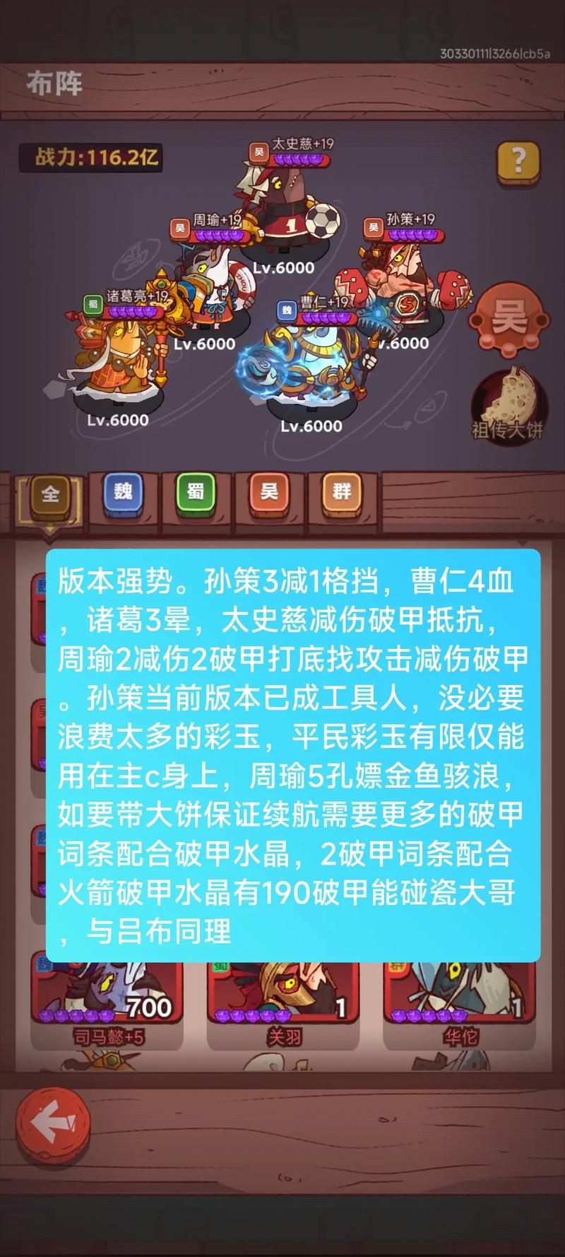 前期推图爬塔:用吴国灼烧流派,搭配诸葛亮、荀彧、周瑜等,利用阵营加成与灼烧叠加。孙策放一号位承伤,遇董卓、关羽等高爆发敌人,加入貂蝉、贾诩等减怒武将反制。爬塔站位根据敌方阵容灵活调整。
