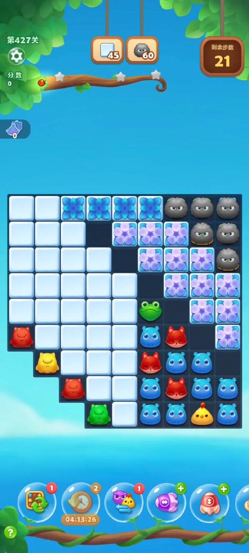 画面色调明快鲜艳,藤蔓背景配清晰界面,消除特效华丽,动物形象逗趣。内置好友排行榜,支持体力互赠,比拼进度,互助合作。