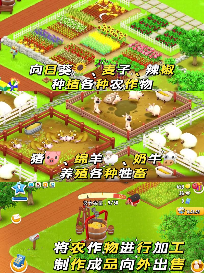 游戏初期种小麦、玉米,升级解锁鸡舍、奶牛场、面包房。加工原材料成高价值产品,完成订单赚金币,扩展农场规模。