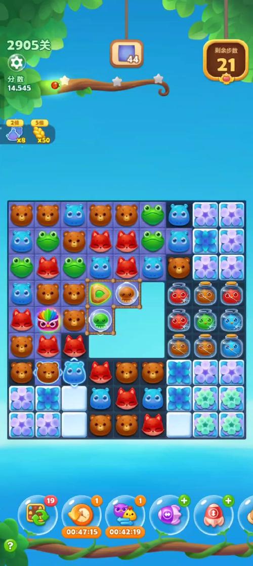 积极组合特效:场地开阔后,借传送带移动,交换动物成直线特效、魔力鸟等强力组合,增强消除效率。