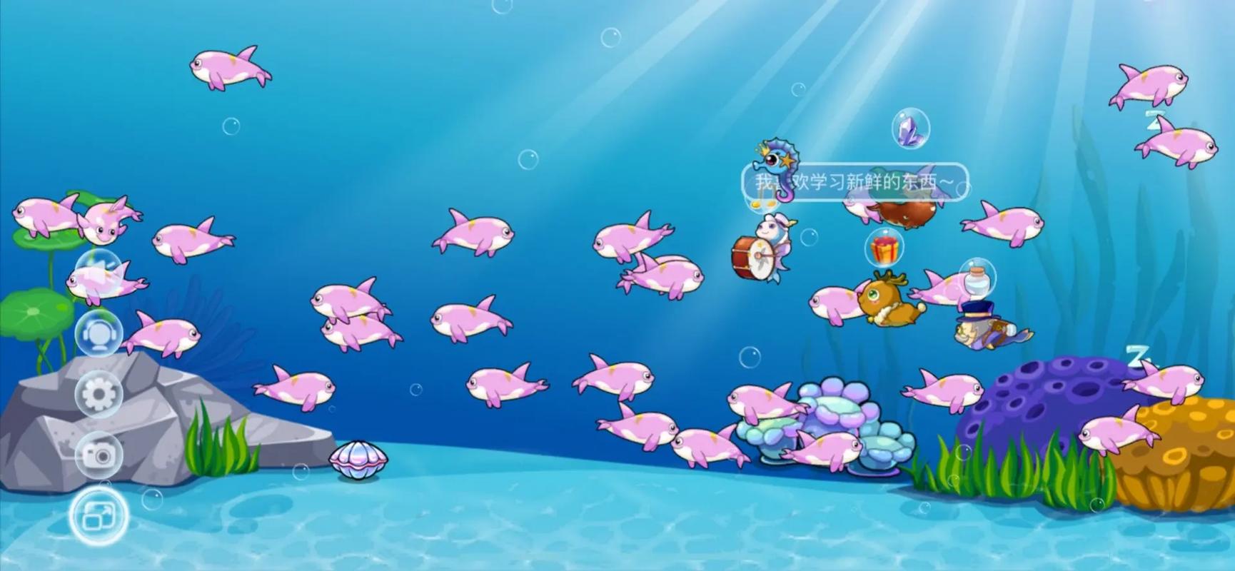科学喂食:选用专用鱼粮,按鱼种、生长阶段控制食量;小鱼泛绿光时,点击粮袋滑动撒食。
