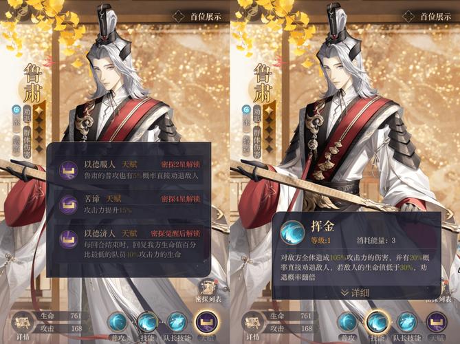 每场战斗派遣五名密探。新手配置:1防御(如郭解)+1治疗+3输出(如阿婵、鲁肃)。优先培养鲁肃(首张必得金卡),后续金卡(防御/治疗)支撑前期开荒。