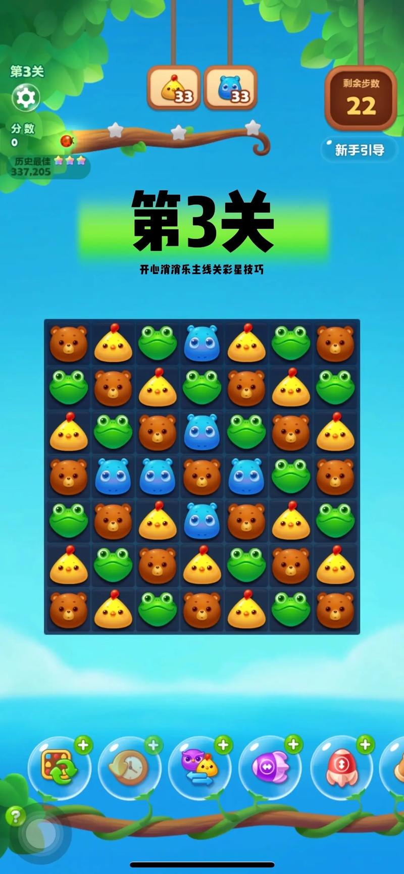 快速上手玩法:按任务提示消除同类型糖果,积累分数达标通关,注意限时限制,超时失败。交换相邻动物,实现三连、四连、五连消除,触发多排混合消除,配合特效音效提升体验。
