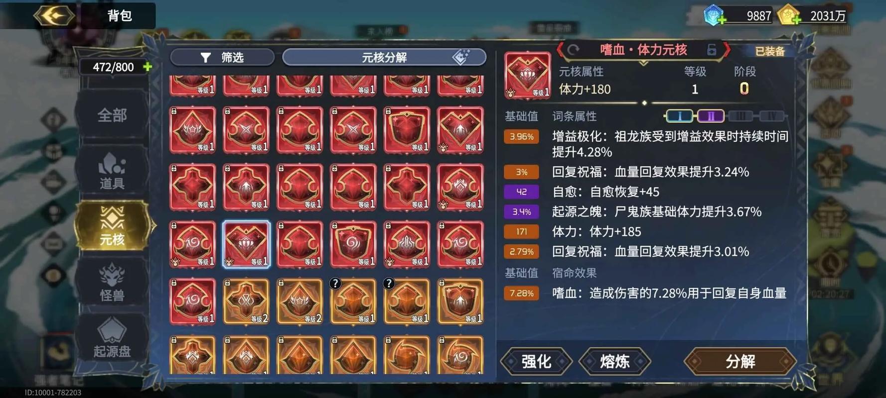 纹章基因配置要点:按怪物定位选属性。输出怪(如暴虐战狂)堆攻击、暴击;防御怪(如钢铁守护者)加生命、护甲。