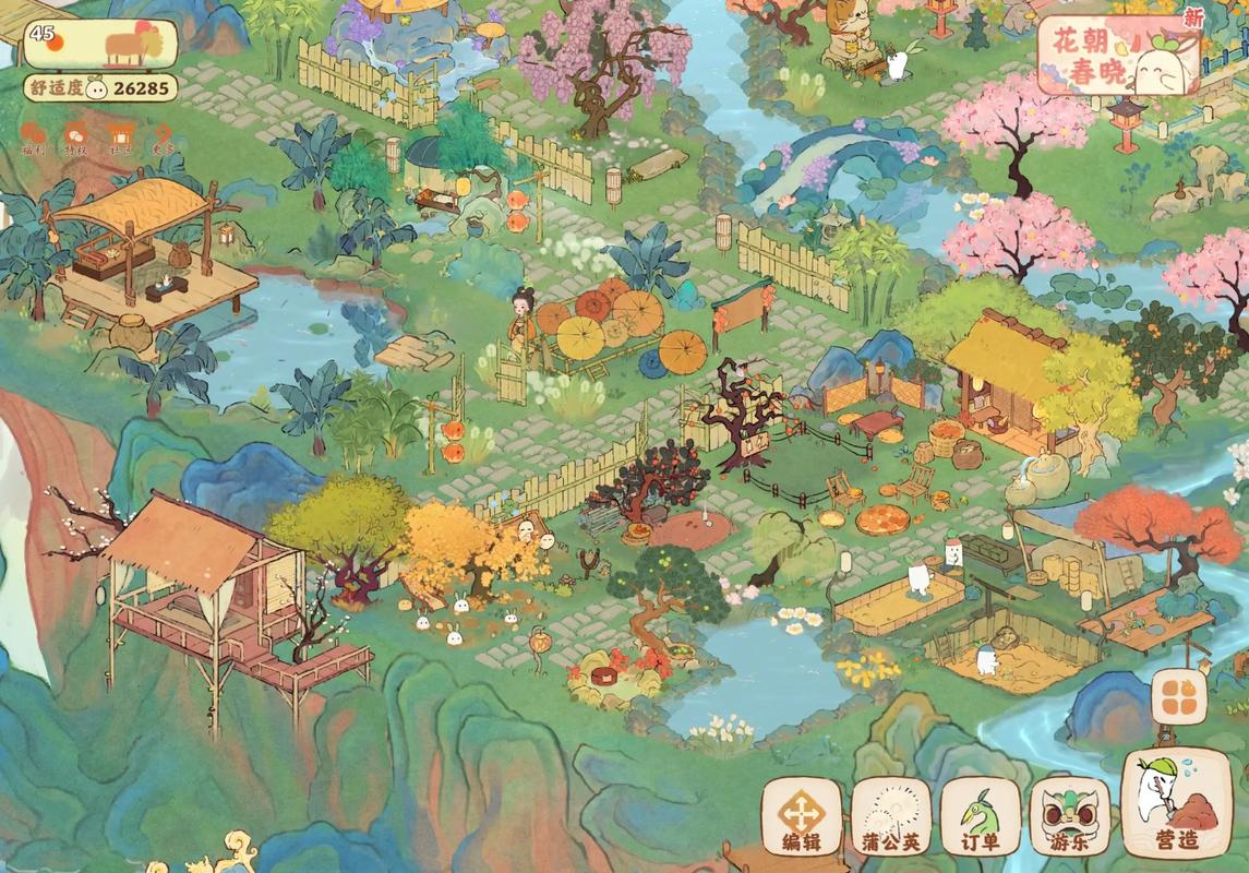 等级提升与内容解锁:升级开趣味玩法、主线故事;小游戏有抚琴、垂钓、放河灯、观星象;主线点地图右侧桃花树进山洞,选右门体验;剧情在独立场景,探索互动推进,部分需特定等级菜肴/作物;剧情完成度升得抽建筑道具,第二章起含多分支结局,每次仅达成一种,建议积重置道具再探索;完剧情得五色土,山洞左下玩数字合并小游戏,通关得特殊资源,激活限时增益(农田收翻倍、商队时缩短等)。