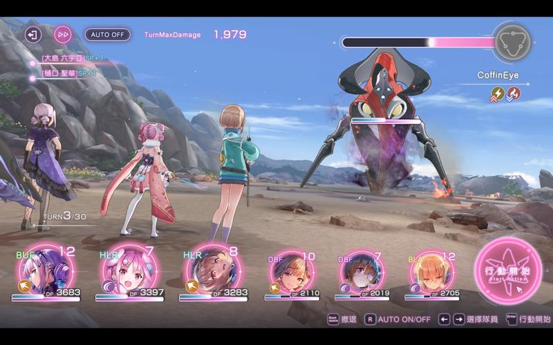 采用回合制战斗,可上场六名角色,分前卫与后卫各三人。后卫不行动不受伤,每回合开始前可自由调换前后卫。战斗中敌我均有HP与DP能量条,HP无法恢复,我方任意角色HP归零即战斗失败。SP点数、破坏度、OverDrive怒气条等机制增加战斗策略。