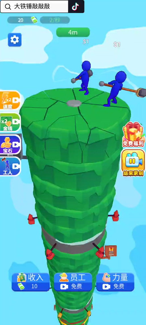 巨大的锤子手机版:525566下载站获取。控制角色穿越障碍,躲避陷阱,收集铁锤。获取对应颜色锤子,锤头变大,增强敲击力,完成关卡收获大量金币。