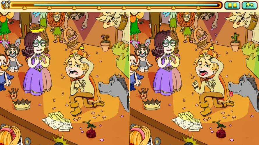 游戏核心玩法:比对两张相似图片,找出色彩、轮廓、位置、元素有无等差异点。差异设计打破常规思维,含幽默反逻辑细节,如方形苹果、动物尾巴变异。