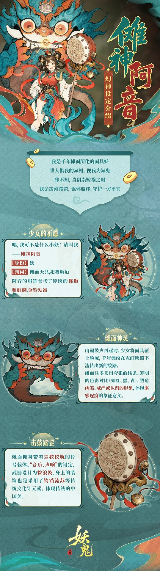 造型设计上,阿音的服饰深挖中式传统工艺内核:下摆以麒麟纹与舞狮图腾环绕,发饰融入精怪意象,行走时铃音清脆灵动,既有少女般的轻盈跳脱,又带着神祇独有的庄重气场。红、黑、青三色构成主视觉基调,搭配夸张的轮廓线条,整体风格诙谐中不失威仪。作为戴面具的特殊存在,她曾被世人误当作灾厄的化身,却始终凭着坚定意志履行守护的职责,如今已成为维系人间安宁的关键符咒力量,每一声铃响,都是结界稳固的信号。