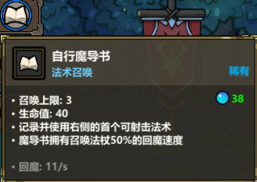自行魔导书是这套玩法的核心输出技能,为啥选它而非啵啵?二者蓝耗相同,但啵啵更适配附加伤害类玩法,比如带毒、减速效果,而自行魔导书能自主释放技能,容错空间拉满——前期就算没凑齐完美召唤体系,捡到啥技能都能先给魔导书用上,后续有更强力的技能再替换也完全ok。
