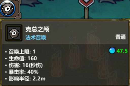 最后说下克总之颅,这个技能伤害不算高,但生命值极高,法术覆盖半径也大,是完美的前排承伤技能——如果没有克总之颅顶在前面,怪物的攻击目标就会优先锁定自行魔导书,而魔导书40点的蓝耗可不低,有克总顶在前头能有效保护核心输出。