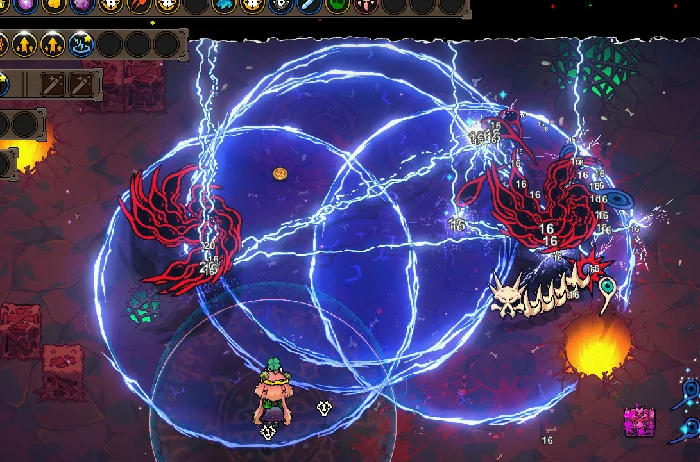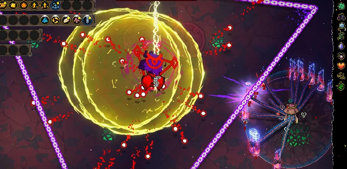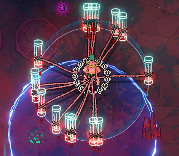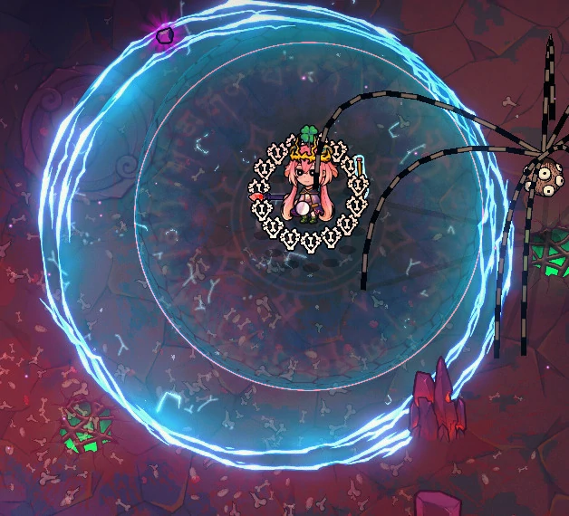 因为输出端有落雷阵就足够强力,这套组合主要是补全防御短板。光之柱可以帮我们阻挡敌方弹幕,寄生虫能小幅提升伤害,公转能让防御效果覆盖更全面,脐带也能进一步强化输出,要是有粘液晶石也可以加入进来。