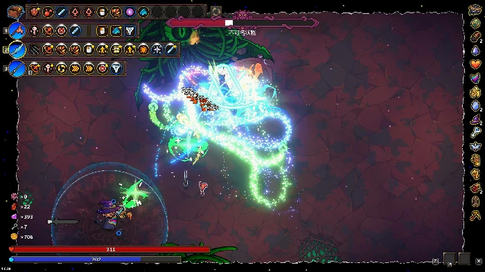 等资源充足后,可以加入多重散射效果来进一步提升同时射出的飞剑数量,再搭配各类加伤遗物和法术强化来拉高飞剑的伤害。这里要注意,多重散射没必要合成升级,相比它附带的属性提升,我们更需要它最基础的增加同时施法次数的效果,以此射出更多飞剑。另外,还可以搭配持续时间增长类属性,通过延长飞剑的寻敌时间来提升伤害。