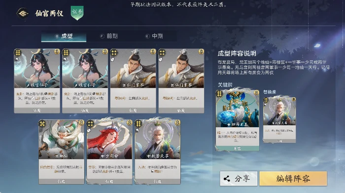 后期阵容只能给个参考方向,毕竟仙庭阵营的灵活性太高了,而且前期拿的剑修、剑客这类实战卡也能一直沿用。