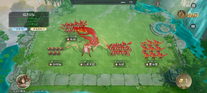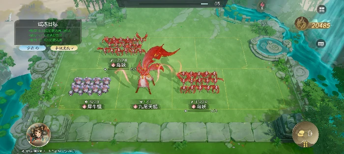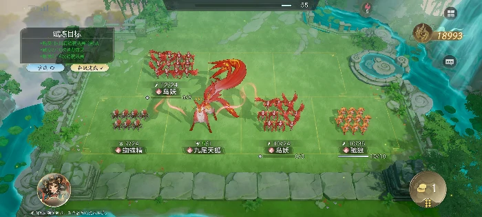 依次部署鸟妖、九尾上场,再补一只鸟妖,接着安排驰狼上场后将其出售