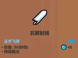 俗称滋水枪,本身实用性很差,施法持续期间同样不能进行其他操作,而且命中难度高,搭配毒系辅助还会在地上留下大量毒液。不过它和瓦解射线类似,搭配引线后就能变成一个还不错的输出法术。它没有瓦解射线的贯通效果,但因为蓝耗更低、伤害更高,单体伤害反而比瓦解射线要高。升级后也没有新增词条。