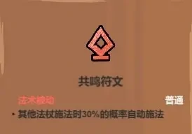 当其他法杖(包括杖灵操控的法杖、魔导书模拟的法杖)施法时,装配了共鸣的法杖会有概率自动触发施法,搭配各类高频率施法的“法术机关枪”体系效果拔群。把核心输出放在副杖由共鸣启动,能避免高蓝耗法术打空蓝条,导致被怪物贴脸却无术可放的尴尬;手持魔女扫帚这类需要全程握持的功能性法杖时,也能把核心输出放在副杖靠共鸣触发;就算玩法体系还没成型,也能充分利用背包里的法术提升输出。总的来说,这是泛用性拉满的法术,它是普通品质,升级难度低,不过一般升到一星就完全够用了。