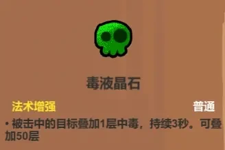 说它是“自杀法术”也不为过,搭配滚石这类法术能铺满全场无差别毒池,没飞行能力的话,很容易把自己和召唤物毒死。至于给怪物上毒?中后期动辄几万秒伤的情况下,毒那点伤害完全不够看。前期伤害不足、怪物血量低的时候可以用,搭配蝴蝶、黑洞这类多段伤害法术能快速叠毒,而且这些法术搭配毒液不会留下满地毒池。另外还有一种玩法,搭配感电王冠自己踩毒玩自爆流,具体可以看后续的遗物介绍。