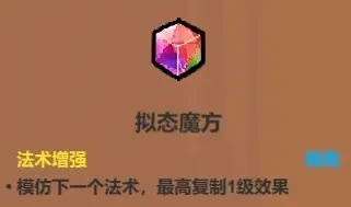 会记录并使用右侧首个可射击法术,包括自身的法术。这里衍生出一种经典的“书叠书”玩法:利用魔导书召唤魔导书的机制,因为它的召唤上限是3,自身先召出3本后,这3本还能各自召唤3本,最终能形成9本魔导书的阵容,等于直接把输出拉到9倍。不过魔导书基础回魔速度只有自身的50%,它会从零开始回蓝,直到蓝量足够才会释放法术,所以未升级的魔导书启动“书叠书”节奏极慢,只有搭配激光这类低蓝耗法术时才能流畅施法,建议一星(回魔75%)之前不要尝试这个玩法,二星回魔速度能到110%,还能用拟态法术复制这个效果。