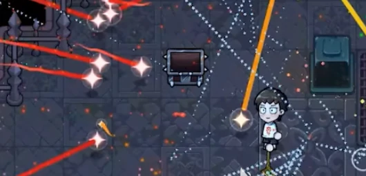第一形态有两种攻击模式:第一种是朝两个方向发射激光,同时向某个方向翻滚前进,这个可以用闪电疾行技能躲开;第二种是朝两个方向发射激光,同时进行旋转(旋转方向是顺时针还是逆时针随机)。战斗中要重点留意它身上凸起的光球朝向,尽量不要被它逼到墙角——不过如果你的角色体型缩小到一定程度,反倒可以卡着墙边输出它。