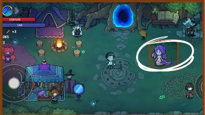 营地NPC功能全解析:左上角可消耗混沌水晶与古神之血提升天赋;右上角用古神之血解锁研究内容;左下角可解锁并升级不同套装;最右侧入口能进入练功房测试搭配效果;最左侧红色触手娘NPC消耗混沌核心激活法术包;冒险关卡内的紫色触手娘可消耗资源禁用指定法术。