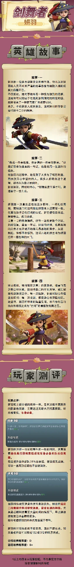 在奔奔王国里,剑舞者妍羽是一名主打穿透输出的英雄。她的讨伐技核心是高额单体与范围伤害,同时还附带减速敌人和提升自身攻击力的效果;远征技则侧重强化全队穿透力与研究速度,非常适合搭配弓兵部队推进战线、发展资源。