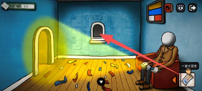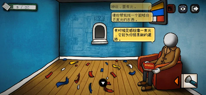 进入房间后多次点击墙上的画,画掉落下来后就能拿到手电筒道具