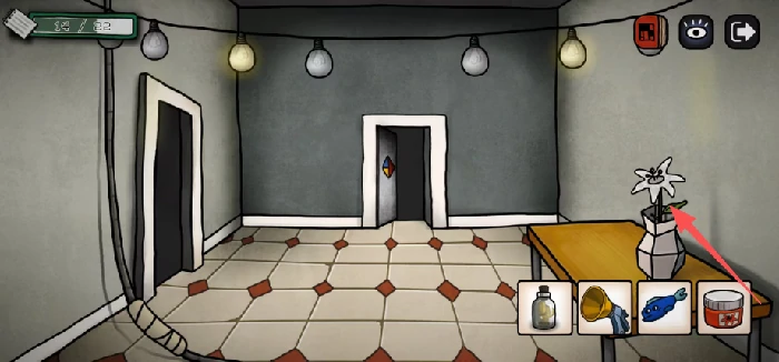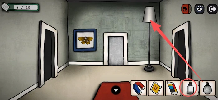 回到铺红毯的房间,把刚才拿到的灯泡装上去,之后用瓶子把蝴蝶收集起来