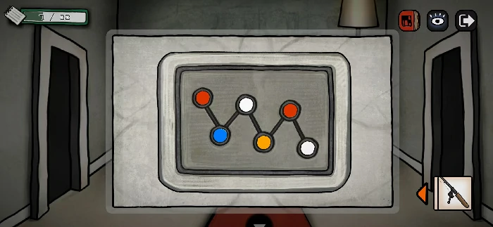 在泳池房间拿到鱼竿道具,另外彩球给出的线索是用来打开红毯房间另一扇门的密码,就是蝴蝶飞离灯泡后显示的顺序