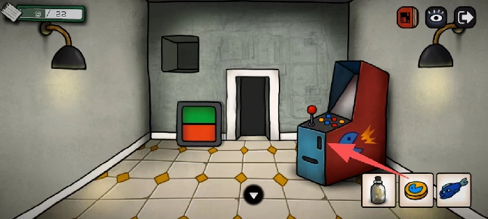 在鱼缸处使用鱼竿,能钓起蓝色的鱼;同时用吸铁石在这里可以拿到一枚圆形硬币