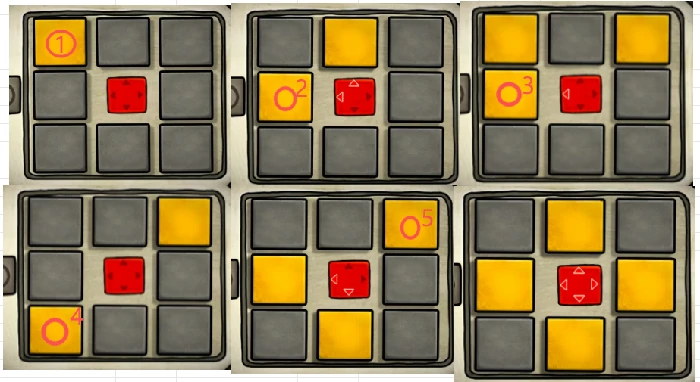 开箱子的小游戏不需要把所有块都变成黄色,只需要按上下左右的逻辑操作就行,具体步骤看标注的圆圈块来点击