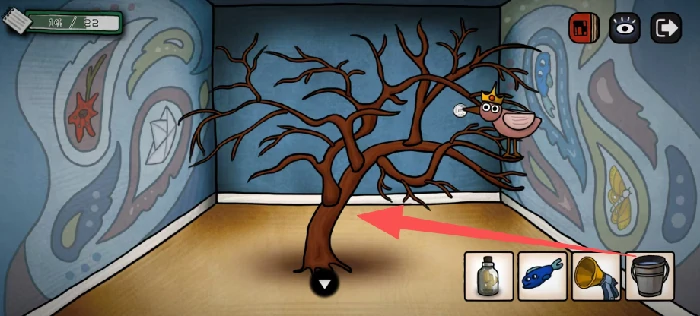 用水浇房间里的树,树上的鸟会飞走,之后就能拿到另一枚硬币和小皇冠道具