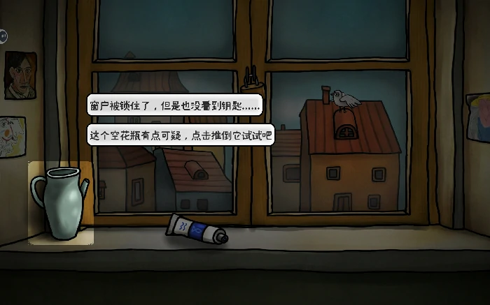 这时会有小鸟叼走蓝颜料,先进入屋顶区域,捡起画笔和杀虫剂,蓝颜料还在小鸟身上,相关剧情后续触发