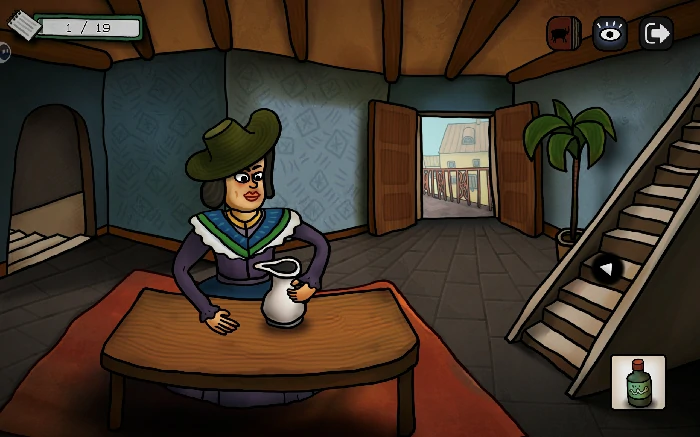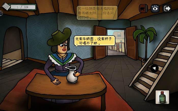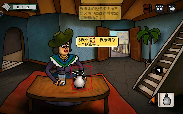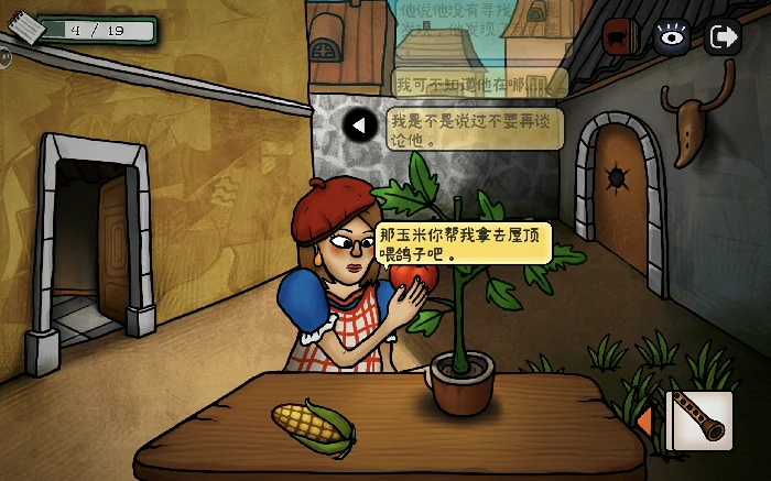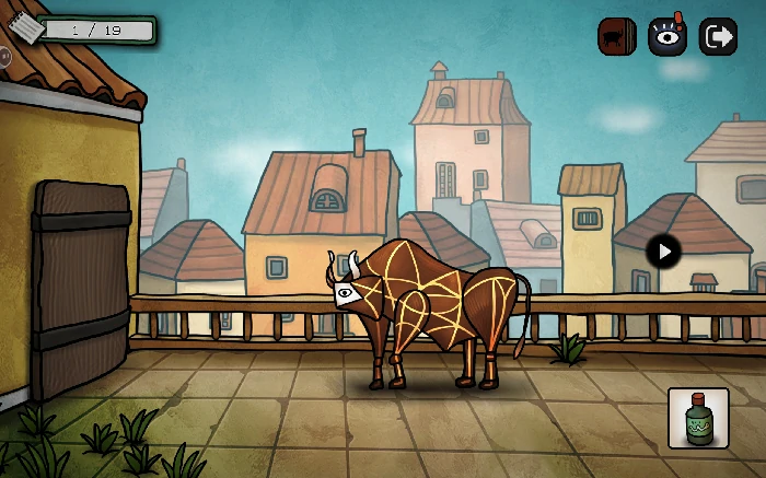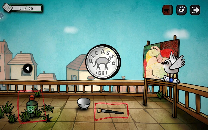 点击左键,能看到阳台上的公牛,把刚拿到的画笔递给它,屏幕上会出现带铅笔的气泡框