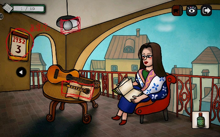 点击右侧的门,就能看到在阳台看书的女孩,顺便捡起单簧管和灯泡;接着疯狂点击左边的日历,把一个月的日期都点完后,就能解锁成就爱情守望者