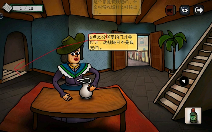 和房间里的女人对话,能得到这些提示:浴室门要调到9:55才能打开;阳台上的鸽子需要投喂;还有个女孩在阳台看书;另外这个女人需要一个玻璃杯
