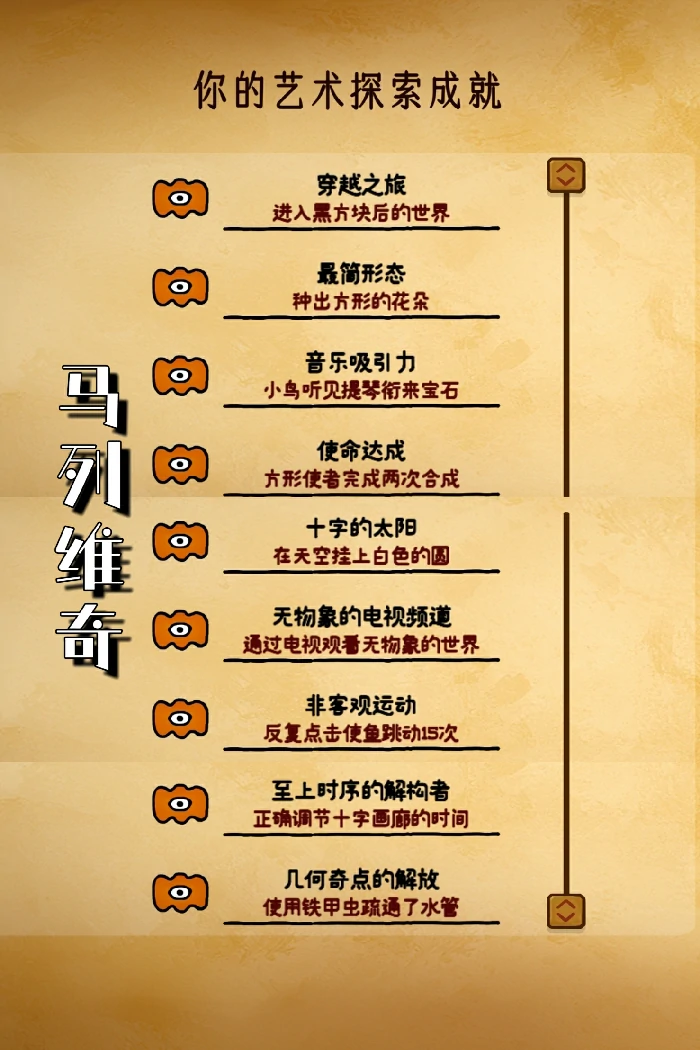 巨匠之眼马列维奇全成就解锁指南:踏入黑方块专属次元;培育方形形态花株;借提琴乐声引鸟衔来宝石;操控方形使者完成两次合成;在天空悬挂白色圆形;还需通过电视进入无物象世界、反复点击鱼使其跳动15次、精准调节十字画廊时间,以及用铁甲虫疏通水管。