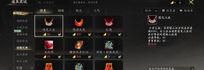 完成上述所有流程后,就能领取到婚书,后续还有花轿送喜、百年好合等可选付费环节。花轿送喜可根据选择的花轿类型支付对应费用并选定行进路线;百年好合环节则需要消耗金币,同时会生成可抽取的红包供其他玩家领取。