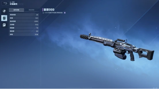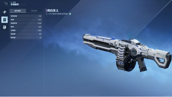 纯白至上的面板数据里,除了换弹速度偏慢,其他属性都很亮眼,后期可以靠插件来弥补换弹的短板,不过开箱子出它的概率感觉比雷霆999低一些,所以放在第二位推荐。