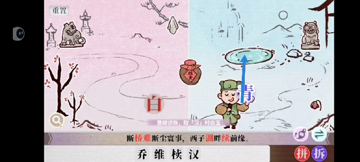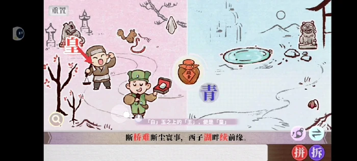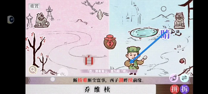 获取汉字需要先拿到椟字,此时人物已经移动到右侧: 首先找到右侧的石狮子并点击,自身变为“睛”字状态。
