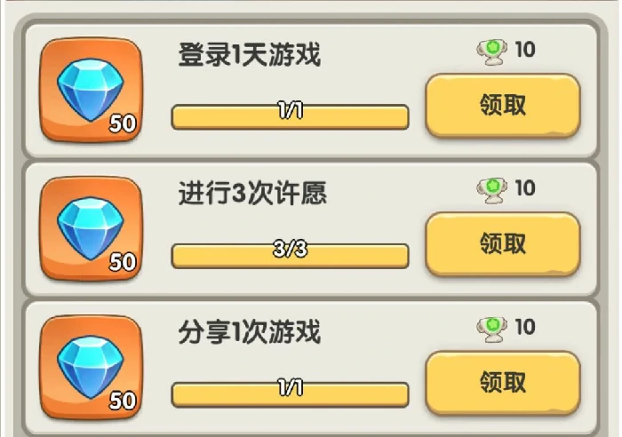 每日任务:登录游戏直接领50钻,完成三次许愿额外得50钻,分享游戏再拿50钻;