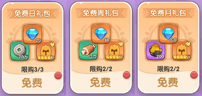 商城礼包页的免费日礼包能领20*2=40钻,免费周礼包每周有50*2=100钻,免费月礼包每月可拿100*2=200钻。