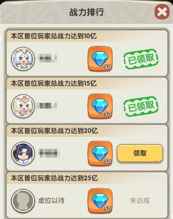 战力榜、冒险闯关榜、海岛探险榜,只要榜一玩家解锁新成就,全服玩家都能领到50钻福利。