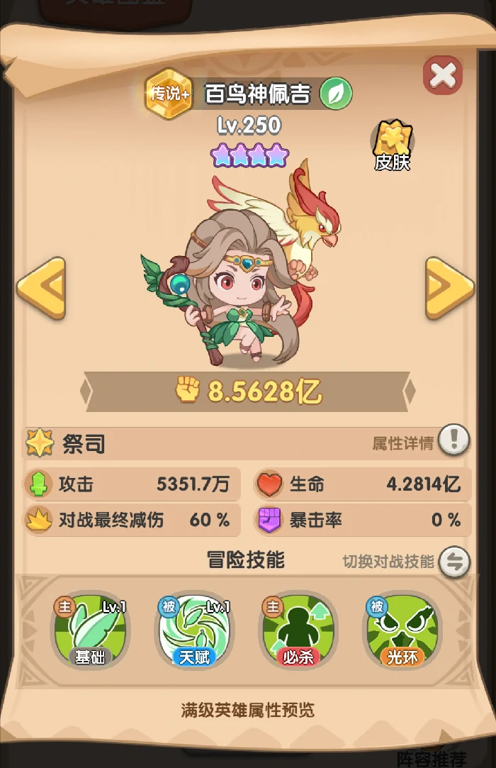 作为新手勇者登录第3天就能拿到的福利英雄,同时也是木系仅有的两位稀有传说英雄之一,百鸟神佩吉的辅助能力十分扎实,前期队伍里有她坐镇,能让冒险省心不少。