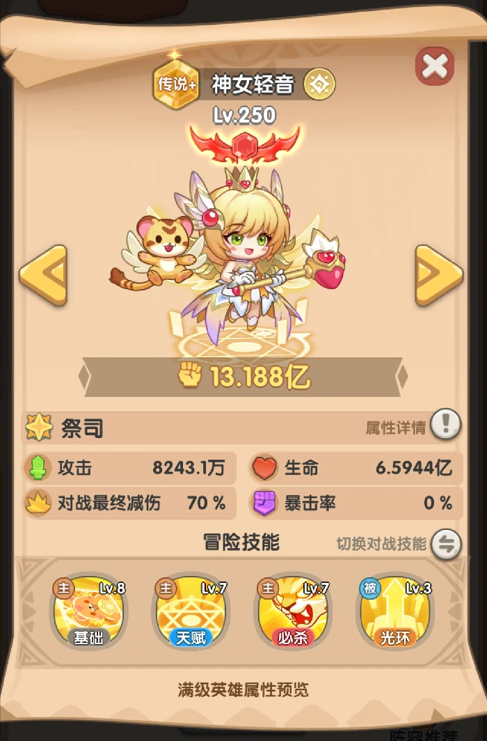 神女轻音作为稀有传说级英雄,入场就自带强力光环buff。契约之书光环能让全队暴击伤害提升10%,而且队伍里的光系角色刚解锁大招,就能直接给大招升一级,效果拉满!等升到指定星级后,全队爆伤的加成还会更高。