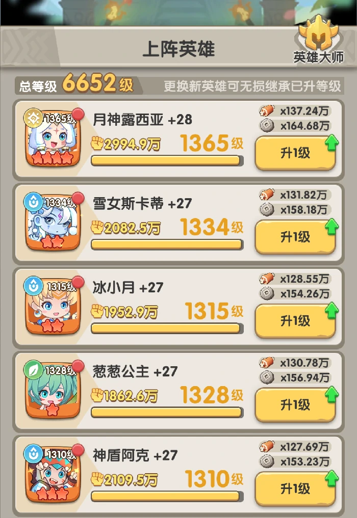 ③雪女斯卡蒂:是新手阶段6元首充就能入手的强力英雄,自带控制效果,还能给全队提供增伤光环,推图时带来的收益非常可观。她不需要投入大量资源就能打出不错的输出和增益,技能升级优先级较低,可以把升级机会留给其他队友。